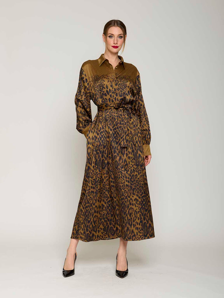 Abito chemisier in raso animalier con dettagli cuoio e strass